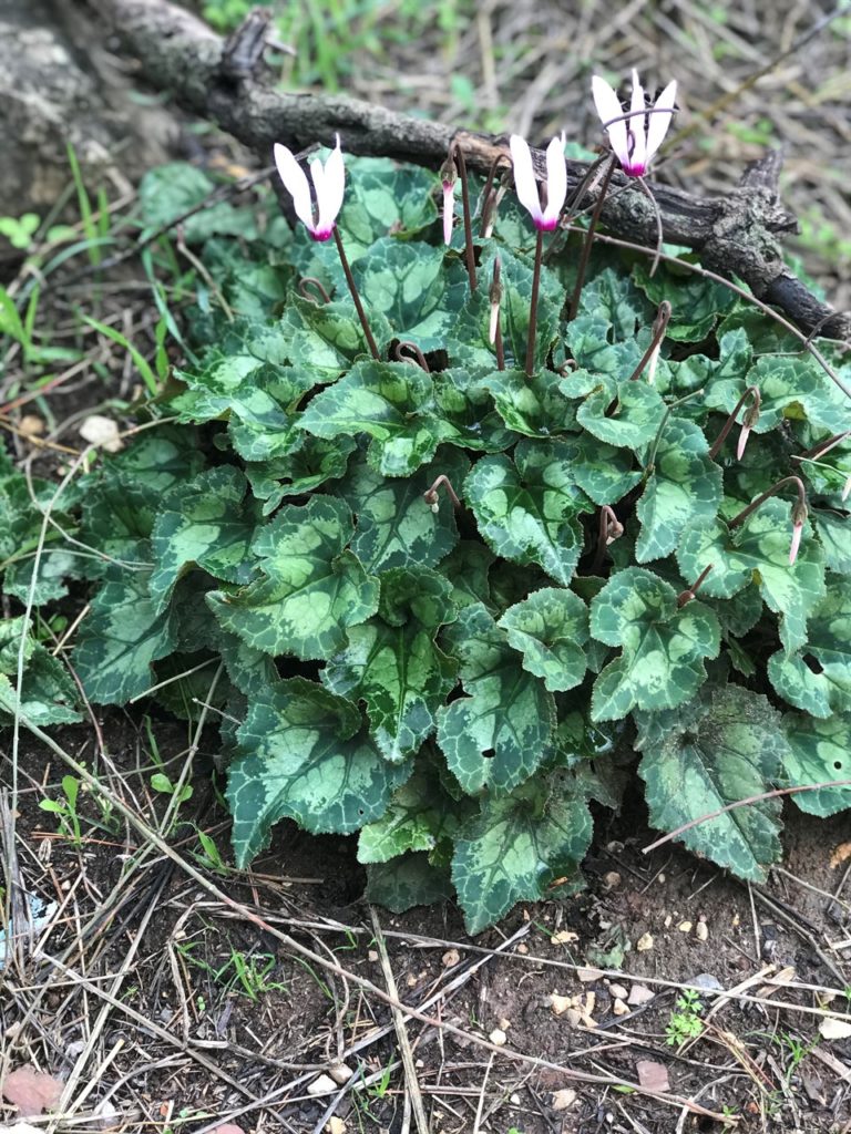 • שביל המדרגות המוביל לכניסה למערה עובר בין חורש טבעי, ושלל רקפות ורודות ולבנות מציצות בצדדים.